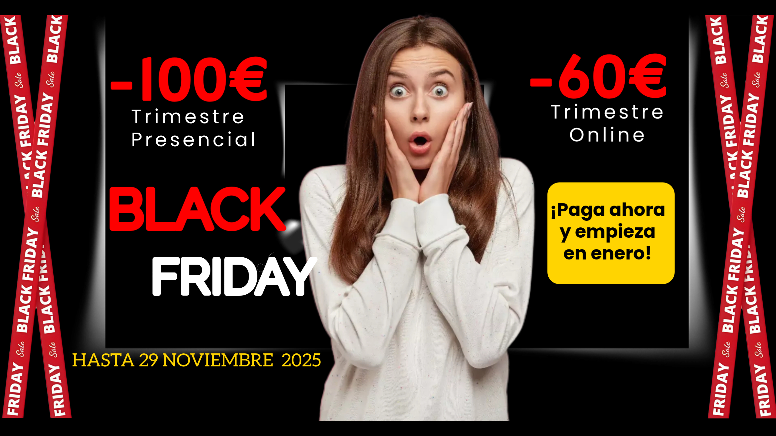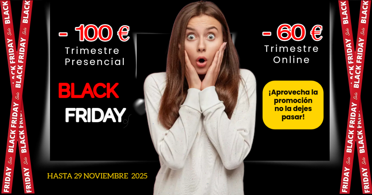 Aprovecha nuestra promoción Black Friday y ahórrate 100€ en un trimestre presencial y 60€ de descuento en el trimestre online.